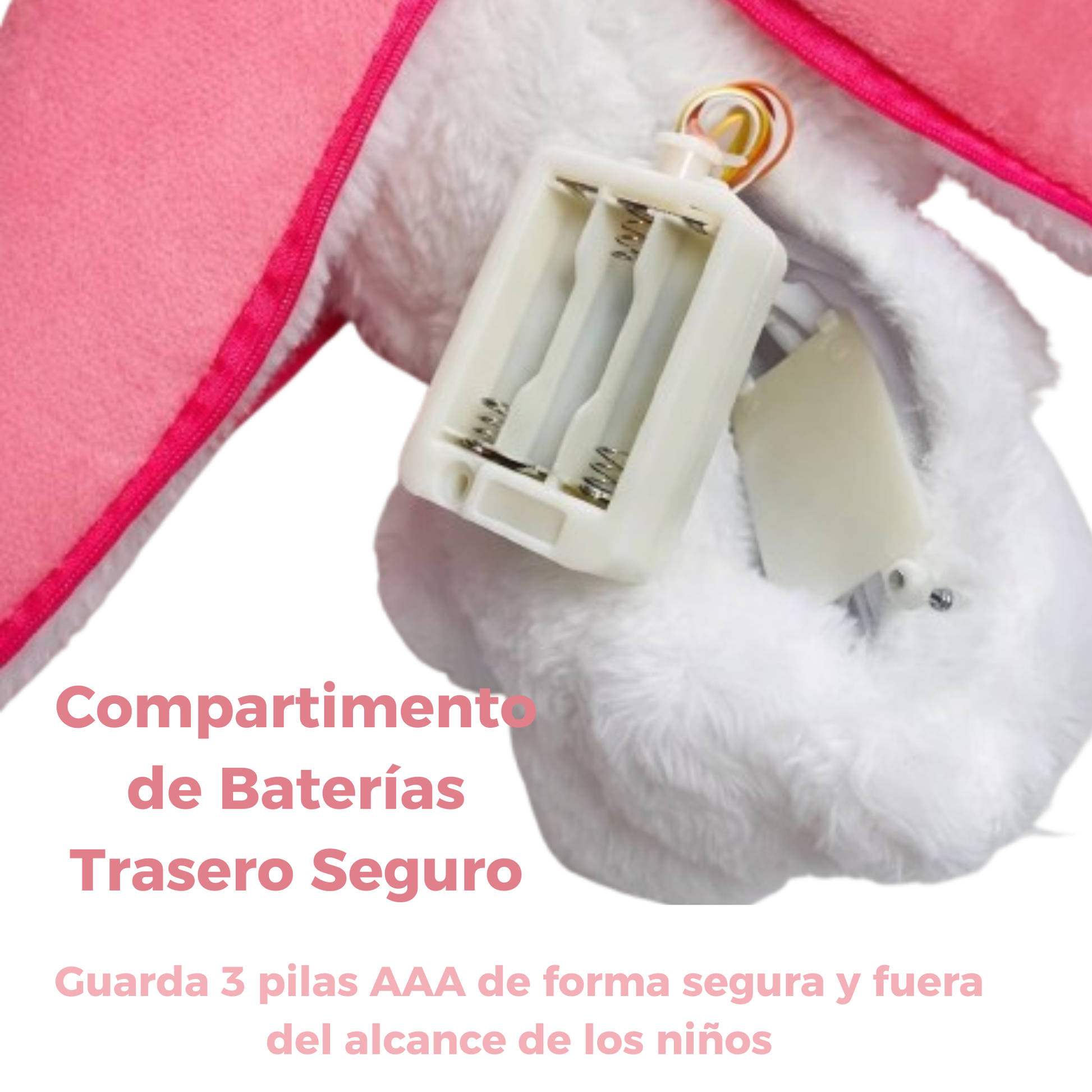 Funciona con 3 pilas AAA colocadas en un compartimento seguro en la espalda del conejito, protegido con una cremallera para mayor seguridad.